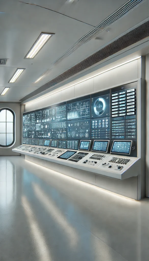 Panel sterowania systemu zarządzania budynkiem (BMS) z uporządkowanymi kablami i wyświetlaczami cyfrowymi