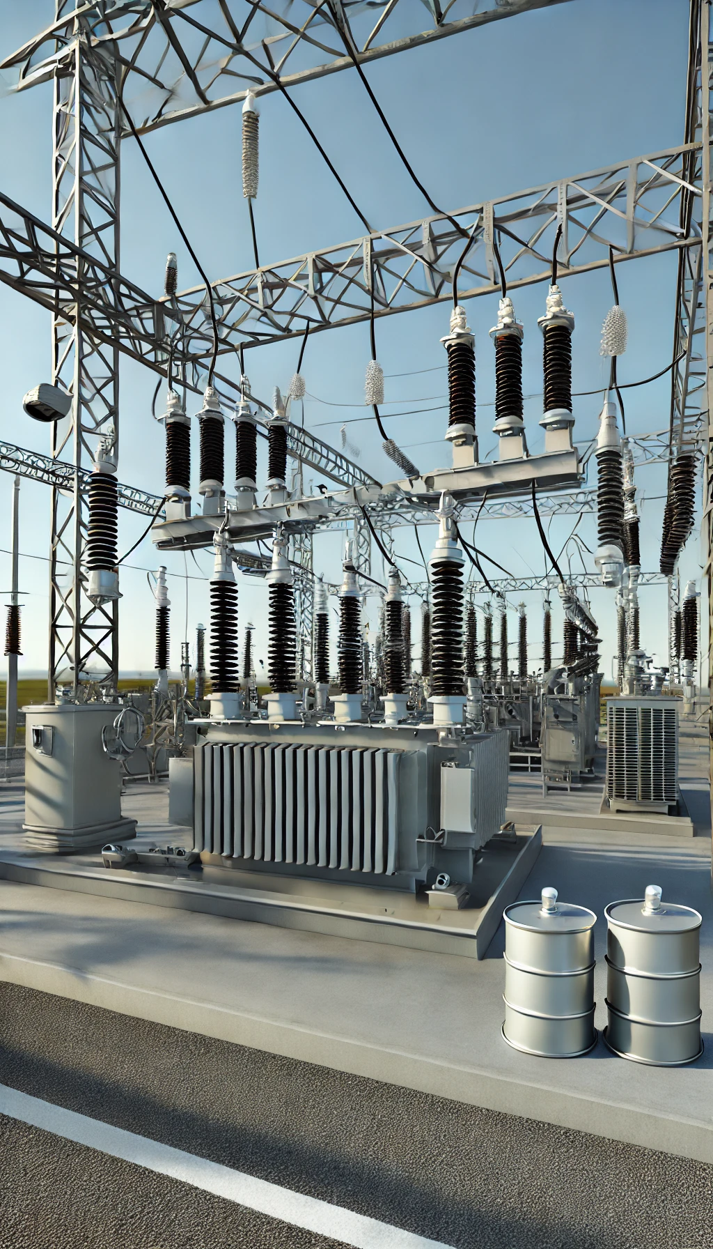 Ten hiperrealistyczny obraz przedstawia szczegółowo zaaranżowaną stację transformatorową wysokiego napięcia, podkreślając złożoność i precyzję nowoczesnej infrastruktury elektrycznej. Kluczowe komponenty, takie jak transformatory, izolatory i kable, są przedstawione z najdrobniejszymi szczegółami, podkreślając doskonałość przemysłową i dbałość o bezpieczeństwo.